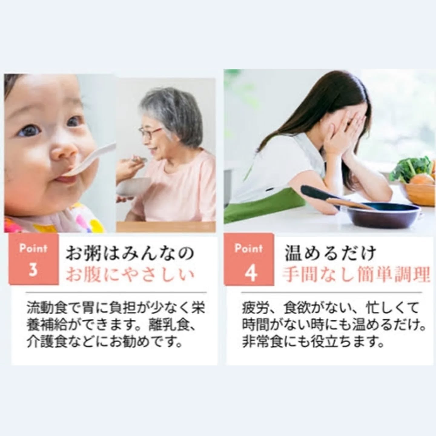 忙しい日の朝食やランチ、体調を整えたい時、離乳食や介護食として…。小さなお子様からご年配の方まで、皆様に安心してお召し上がりいただける、心も体も温まるお粥です。